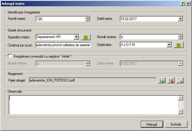 La înregistrarea unei ieșiri în registru, aplicația stochează următoarele informații: