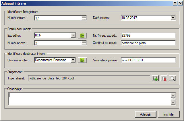 La înregistrarea unei intrări în registru, aplicația stochează următoarele informații: