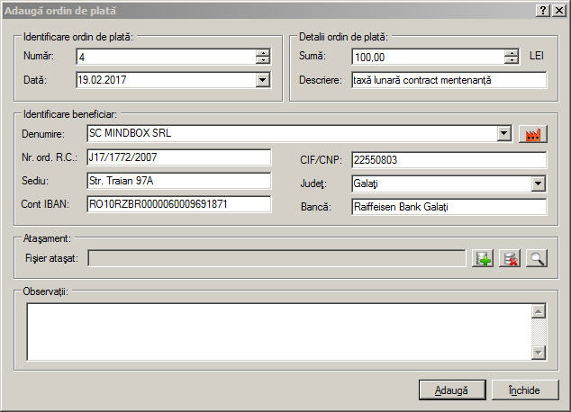 Aplicația oferă posibilitatea înregistrării ordinelor de plată emise de către firma dumneavoastră.