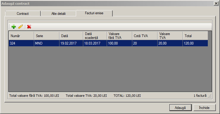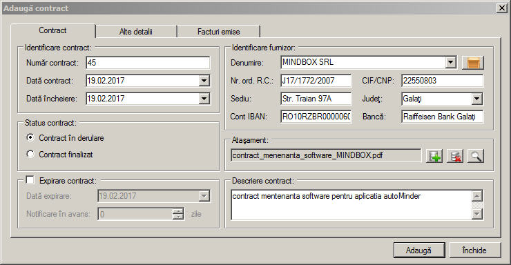 La înregistrarea unui contract, aplicația stochează următoarele detalii: