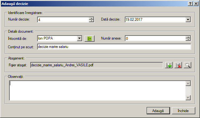 La înregistrarea unei decizii în registru, docExpert stochează următoarele informații: