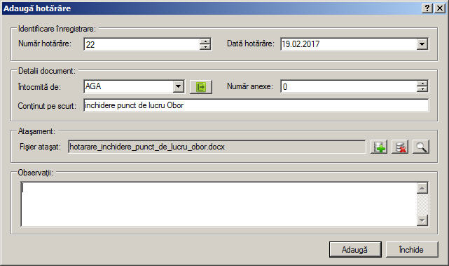 La înregistrarea unei hotărâri în registru, aplicația stochează următoarele informații: